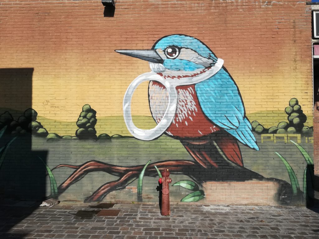 Dalla parte opposta, invece, si passa a un animale decisamente più familiare: un panciuto martin pescatore. Il volatile riempie quasi completamente il muro in tutta la sua magnificenza. L’artista ne ha messo in risalto i colori, blu e rosso, anche grazie alle meravigliose sfumature verdi dello sfondo, che richiama la campagna parmense. In quella che sembra una bellissima fotografia bucolica, c’è un elemento che è impossibile non notare. L’uccellino, infatti, è stretto da un anello di plastica, usato per tenere insieme le lattine di birra. L’oggetto non rompe la composizione del quadro ma è comunque percepito come un elemento di disturbo, per porre l’attenzione dello spettatore sul tema dell’ecologia, in maniera semplice e chiara.
